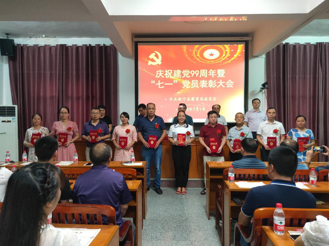 2020年7月1日,教育系统庆祝建党99周年暨“七一”党员表彰大会在局七楼可视会议室隆重召开。大会由局党委委员、副局长伍桄宏同志主持。全体与会人员在局党委书记、局长陈震同志领誓下,庄严重温入党誓词。局党委委员、副局长李永虎同志宣读了表彰通报,授予唐华艳等49名同志“共产党员模范示范岗”称号。与会局领导为受表彰同志现场颁奖。局党委书记、局长陈震同志在大会上为全体同志上了一堂专题党课,要求全县教育系统党员教师进一步加强学习,坚定为党的教育事业奋斗终身的信仰;要准确定位,做合格党员;要树先进、学先进,大张旗鼓地宣传受表彰的同志及其先进事迹;要大力培养青年教师,把优秀青年教师发展为党员;号召教育系统广大党员在提高全县教育教学质量、疫情防控常态化、脱贫攻坚、义教均衡迎国检等工作中充分发挥先锋模范作用。全体受表彰的同志及县属各学校、各乡镇中心学校党(总)支部书记和局机关党支部委员参加了表彰大会。