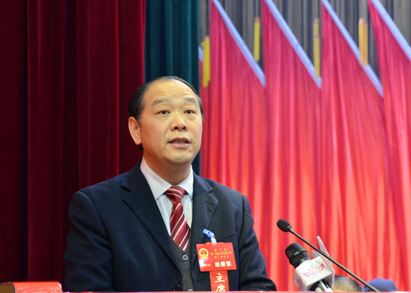 图为县委副书记、县长谭精益向大会作报告