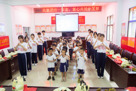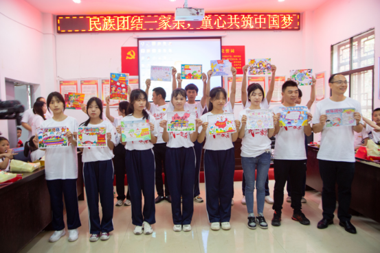 “五十六个民族,五十六枝花,五十六个兄弟姐妹是一家……”在全场集体合唱《爱我中华》的歌曲中活动达到了高潮,大家一起唱歌,一起舞蹈,手拉着手,心连着心,节日的喜悦洋溢在每一位孩子们的脸上,幸福的笑容在他们心中绽放。随后,来自新宁县职业技术学校的志愿者和圳源小学的学生互赠关于民族团结的画作,营造了共同团结进步、民族一家亲的良好氛围,让民族团结的种子根植于青少年们的心田。