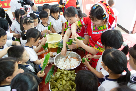 活动当天,正值端午节来临之际,为了让当地学生了解感受历史悠久的传统文化,志愿者给孩子们讲述了端午节的由来和屈原的故事,并手把手教孩子们一起包粽子,在潜移默化的过程中加深学生对中华传统文化的自信和认同。