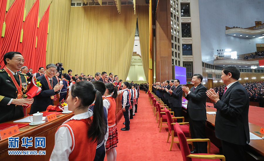 2018年12月18日,庆祝改革开放40周年大会在北京人民大会堂隆重举行。中共中央总书记、国家主席、中央军委主席习近平在大会上发表重要讲话。这是习近平等鼓掌向受表彰人员表示祝贺。