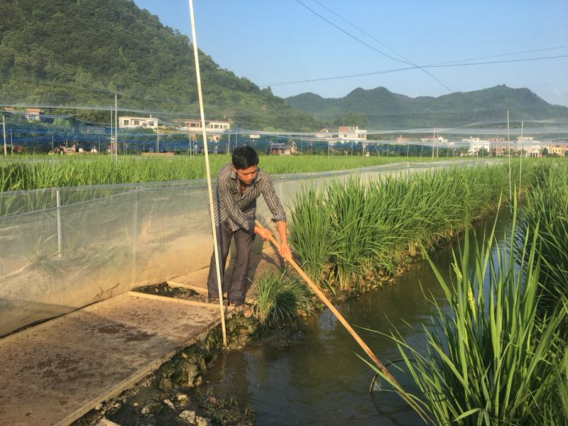 图为王贵明在金稻蛙养殖田里清理杂物