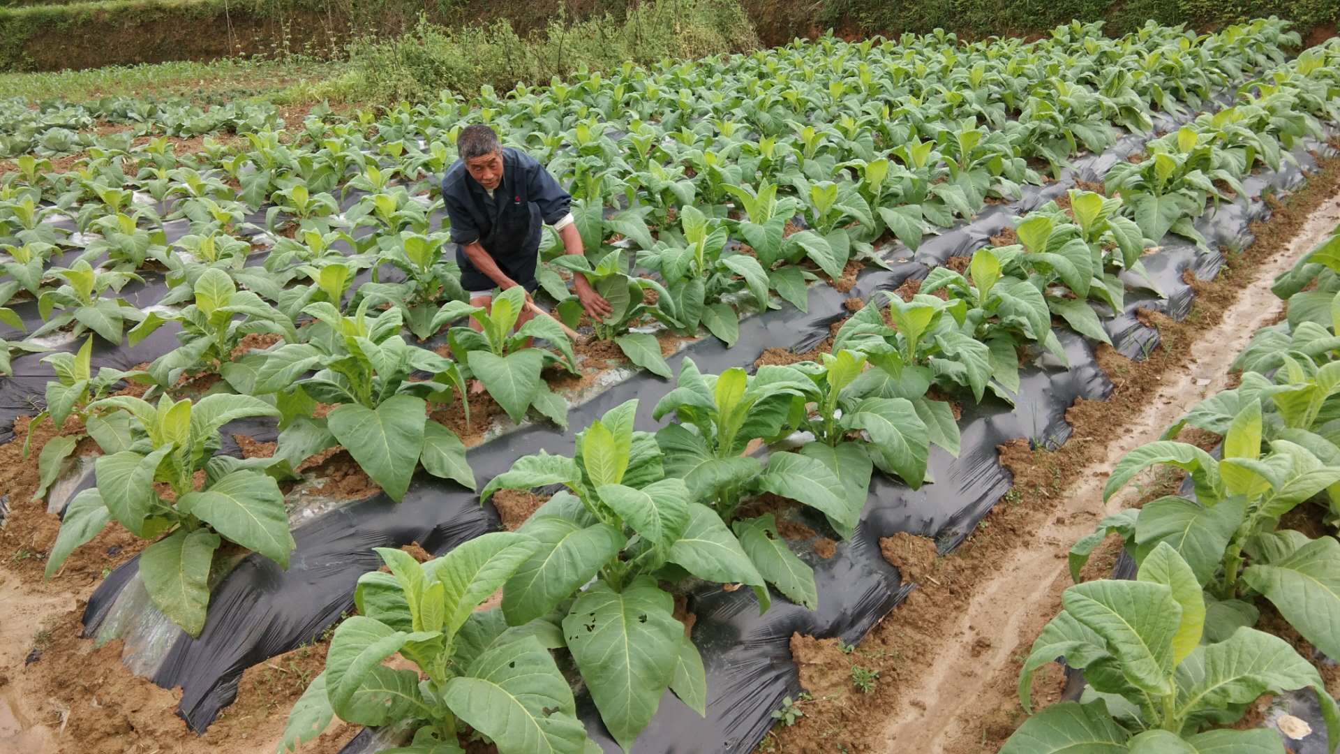 图为种养大户文德忠在烟地里除草