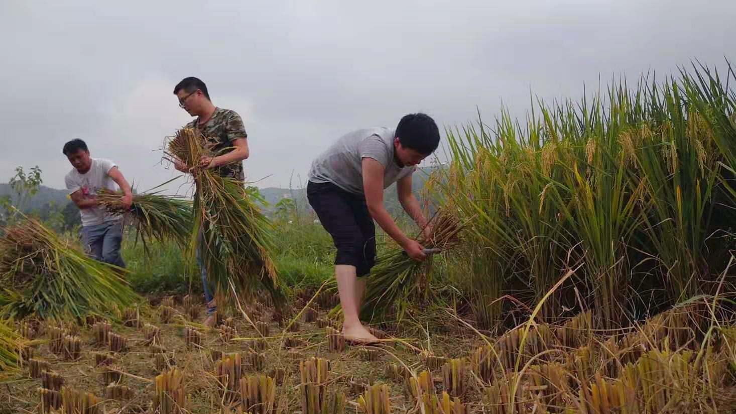 割禾、打禾、装袋……队员们越做越熟练,动作也越来越快。时近中午,温度越来越高了,太阳晒红了队员们的脸,汗水湿透了队员们的衣衫,大家没有歇息。人多力量大,中午十二点半,一亩稻田就收割完了,队员们又把稻谷一袋袋扛上田坝运回了家,摊晒在晒谷坪上。