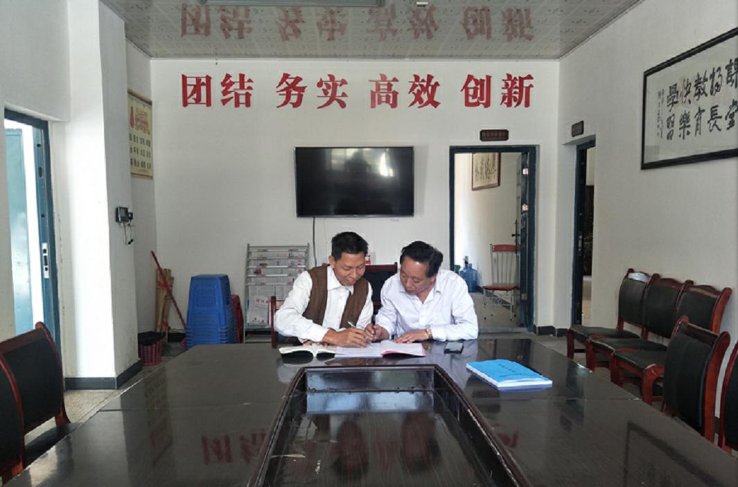 图为崀山培英学校党支部书记指导退休党员学习《习近平关于“不忘初心、牢记使命”论述摘编》