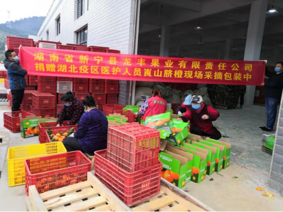 (图为新宁龙丰果业有限责任公司向湖北疫区捐赠崀山脐橙)