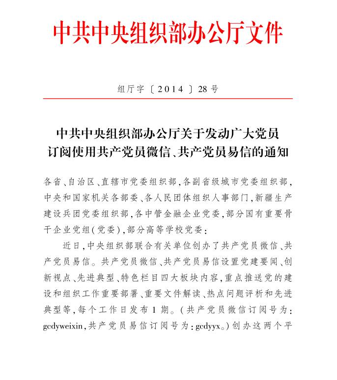 中组部办公厅关于发动广大党员订阅使用共产党员微信、共产党员易信的通知