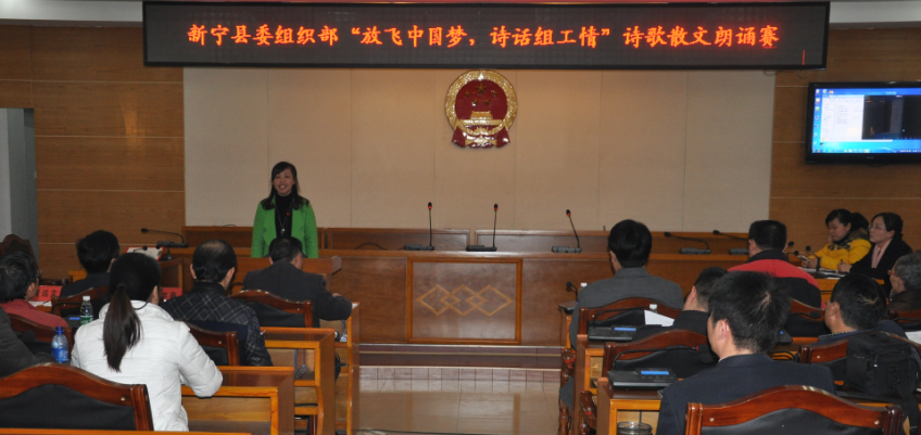 为弘扬中华优秀传统文化,陶冶组工干部情操,大力推进组工文化建设。2014年12月30日,新宁县委组织部机关隆重举行“放飞中国梦 诗话组工情”诗歌散文朗诵比赛,部机关的19名干部职工参加了比赛,县委常委、组织部长、统战部长肖松海出席并担任评委。